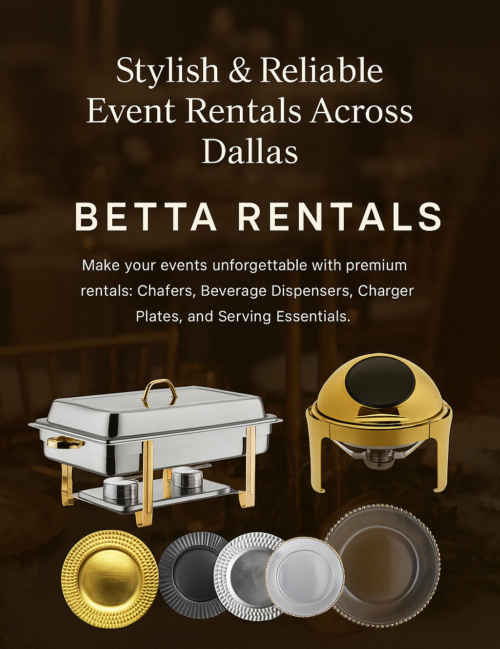 Make your events unforgettable with premium rentals: chafers, beverage dispensers, charger plates, and serving essentials.